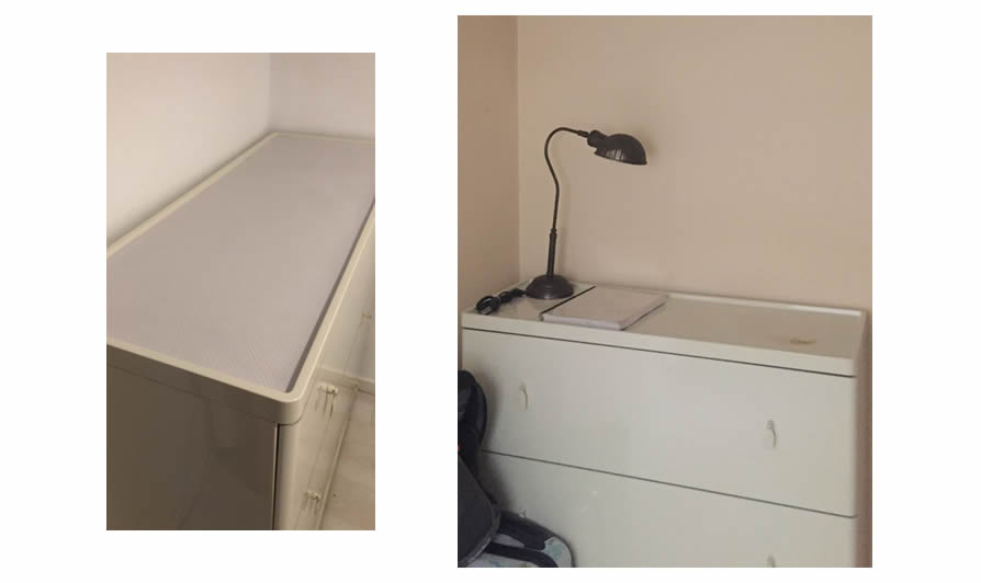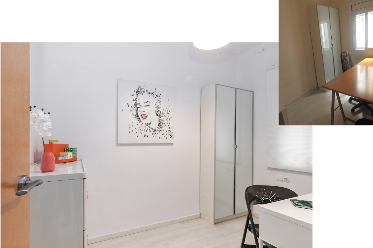 La habitación individual de la entrada era interior y más bien pequeña así que la distribución debía de ser acertada para que cupiesen todos los elementos, en este caso se compró la cama y el armario, la mesita se aprovechó y el radiador se compró también ya que era la única estancia que no disponía de climatización.