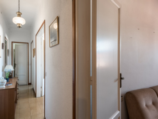 En este caso, las puertas eran blancas, estaban bien cuidadas, pero tenían unas tapetas marrones y unas manetas anticuadas, ambas se cambiaron, se despejó el pasillo de muebles auxiliares y se colocó pladur en el techo para conseguir una iluminación integrada y que abarcase todos los rincones.