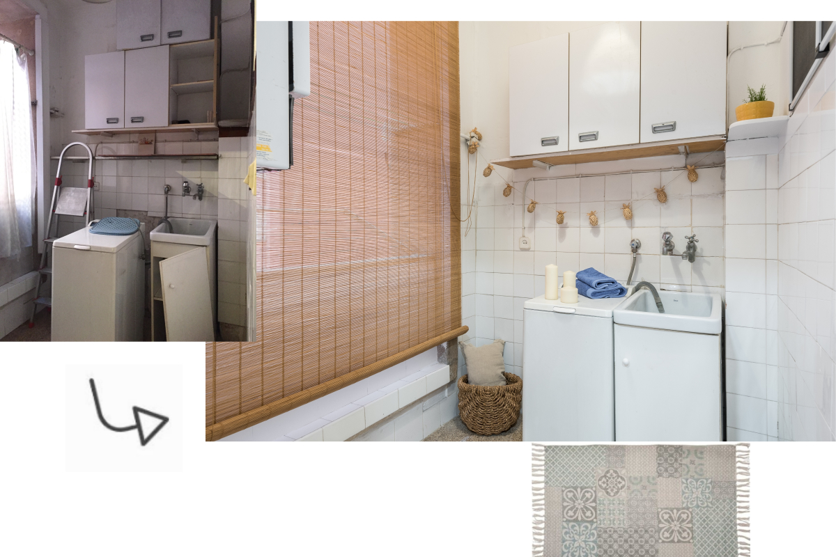 Y por último la galería, os lo he comentado antes, me dio algún que otro dolor de cabeza, pero al final encontré la solución, se pintaron y arreglaron los azulejos, se limpió a fondo, se recolocaron los mismos muebles, la cortina que había se sustituyó por una de bambú a juego con una guirnalda de piñas, se cambió la iluminación y se puso una alfombra de suelo hidráulico.