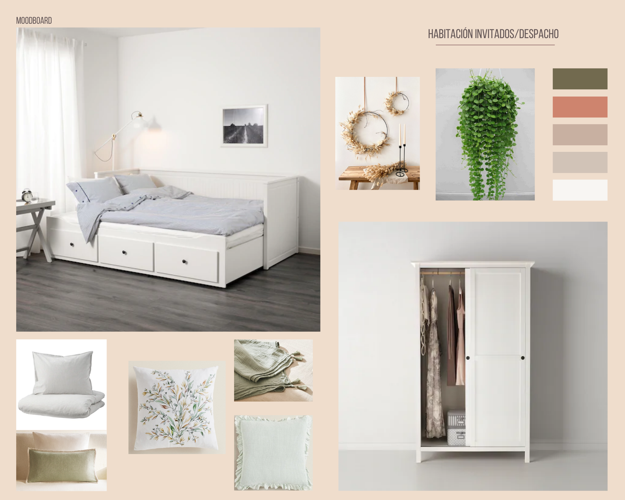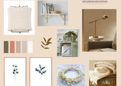 Esta habitación de invitados/despacho se decoró siguiendo el estilo fresco y floral de la vivienda. Las fibras naturales, los cuadros botánicos y los tonos neutros y toques de verde mantienen una armonía.