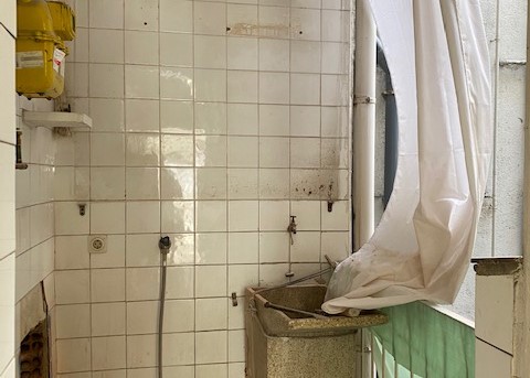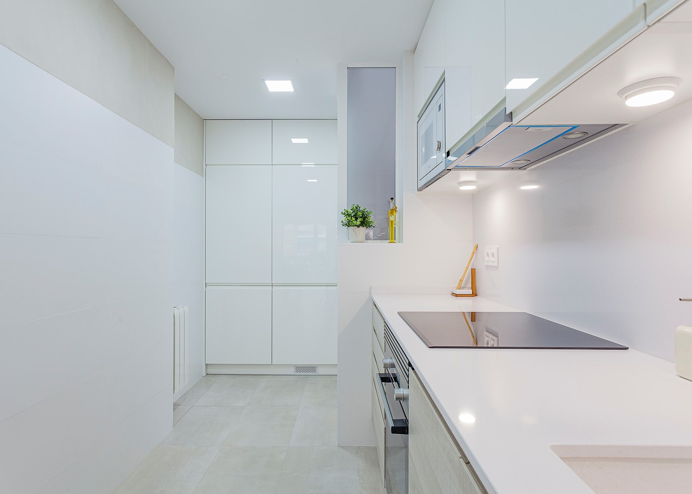 2. Diseñar la cocina con una amplia puerta de hierro y cristal en blanco para que visualmente quedase abierta pero manteniendo la posibilidad de cerrarla después de cocinar. Incorporar el lavadero a la cocina para conseguir más almacenaje.