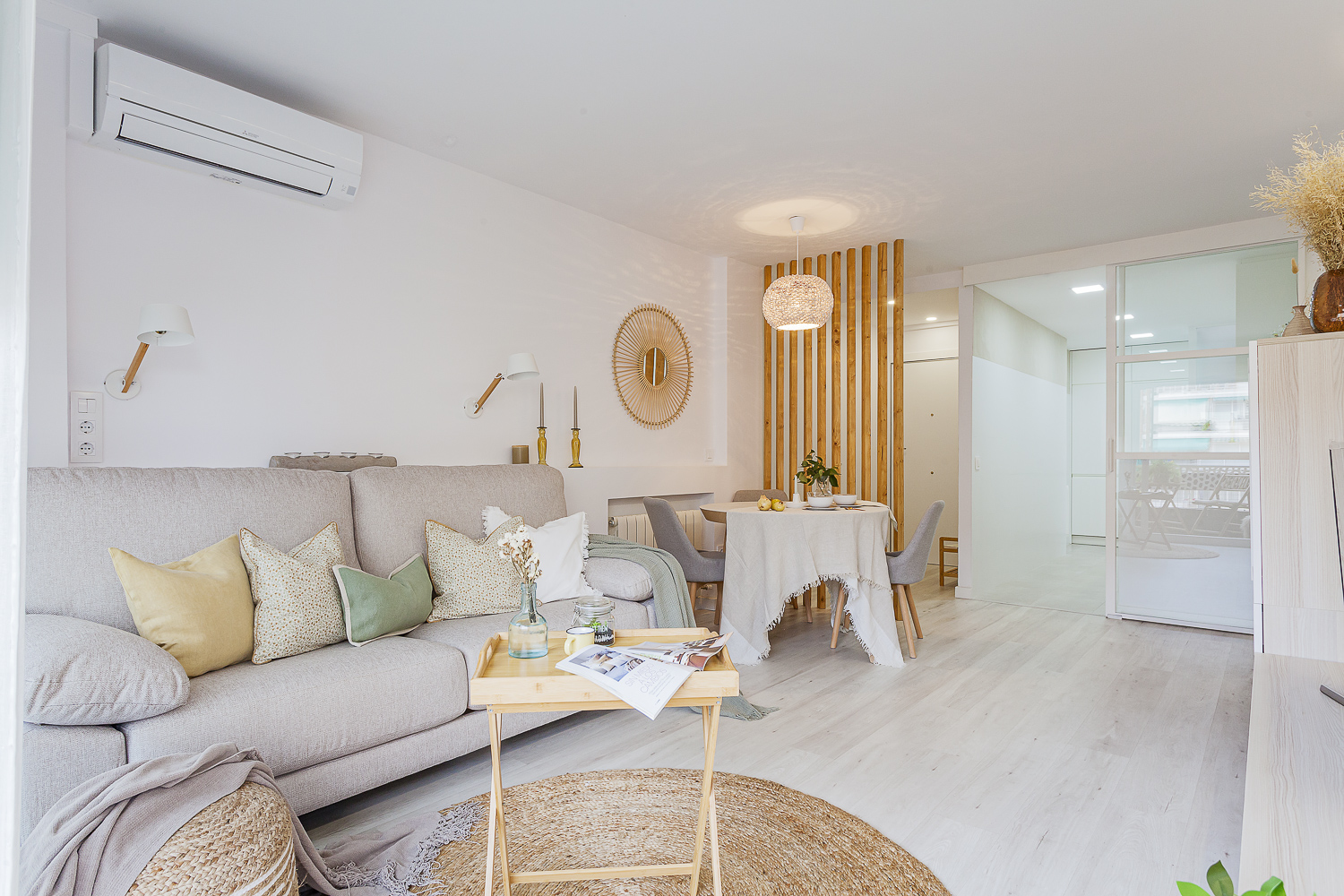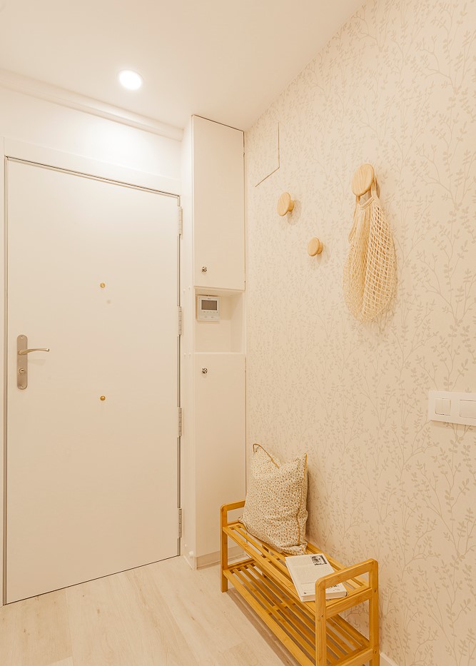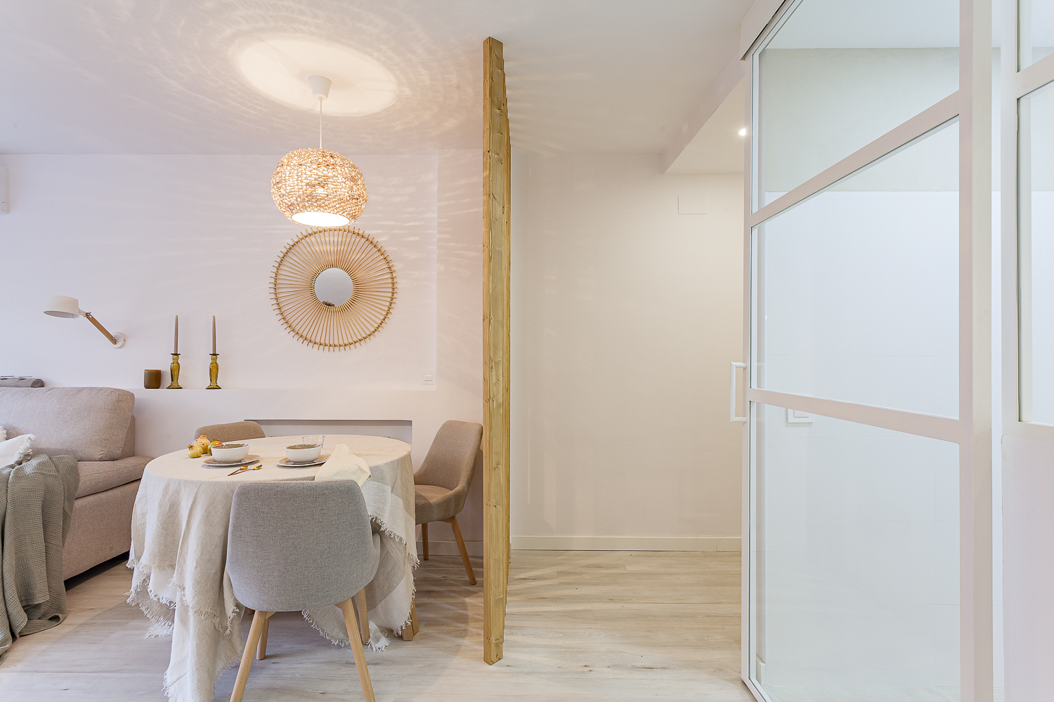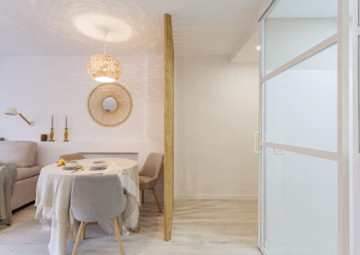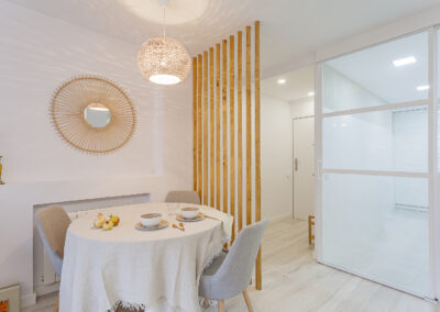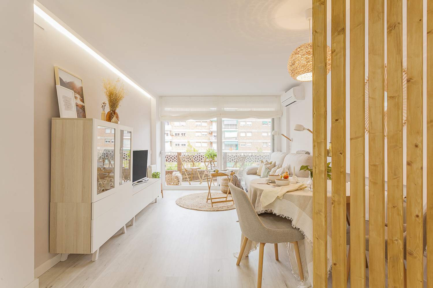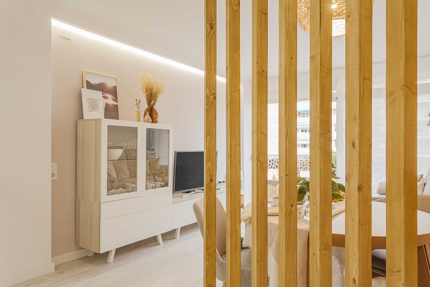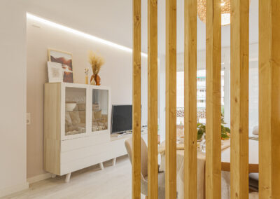 1. Apertura del salón respetando pared en el recibidor de 1,20 cm. Sustituir el tabique del recibidor por un discreto separador de madera que dejaba entrever el paso al salón y que filtraba la luz de punta a punta.