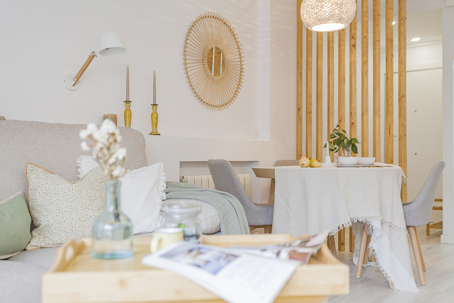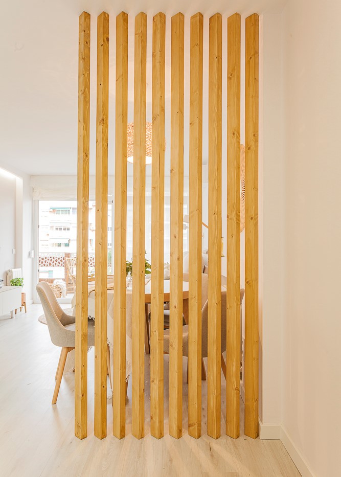 El salón comedor mantiene su privacidad respecto a la entrada gracias a estos listones en roble. Los metros se multiplican al eliminar los tabiques que había antes y quedan conectadas las estancias principales, salón comedor, cocina y terraza.