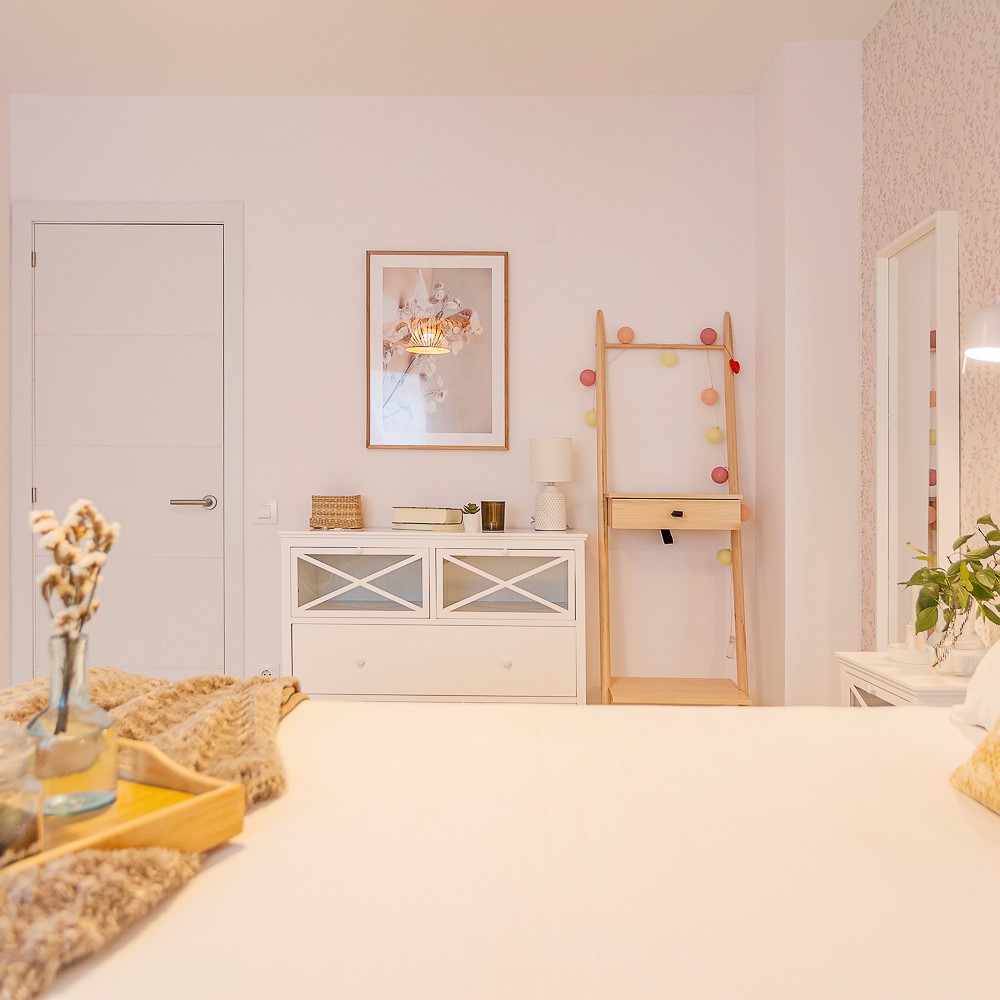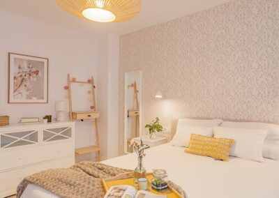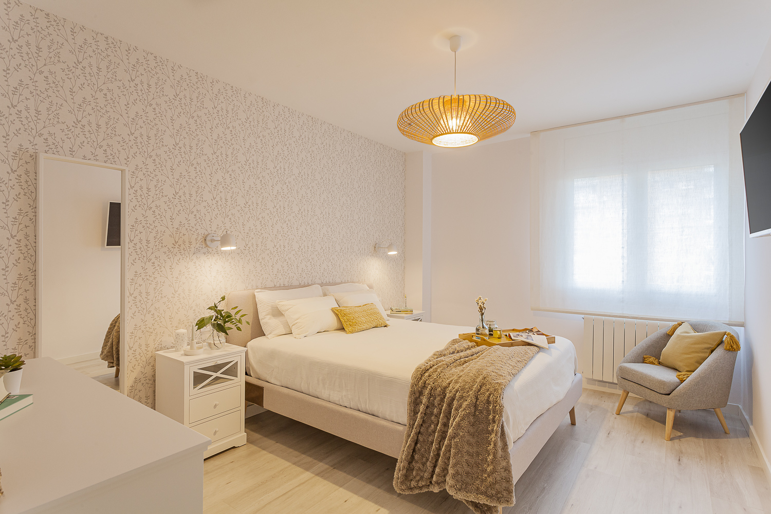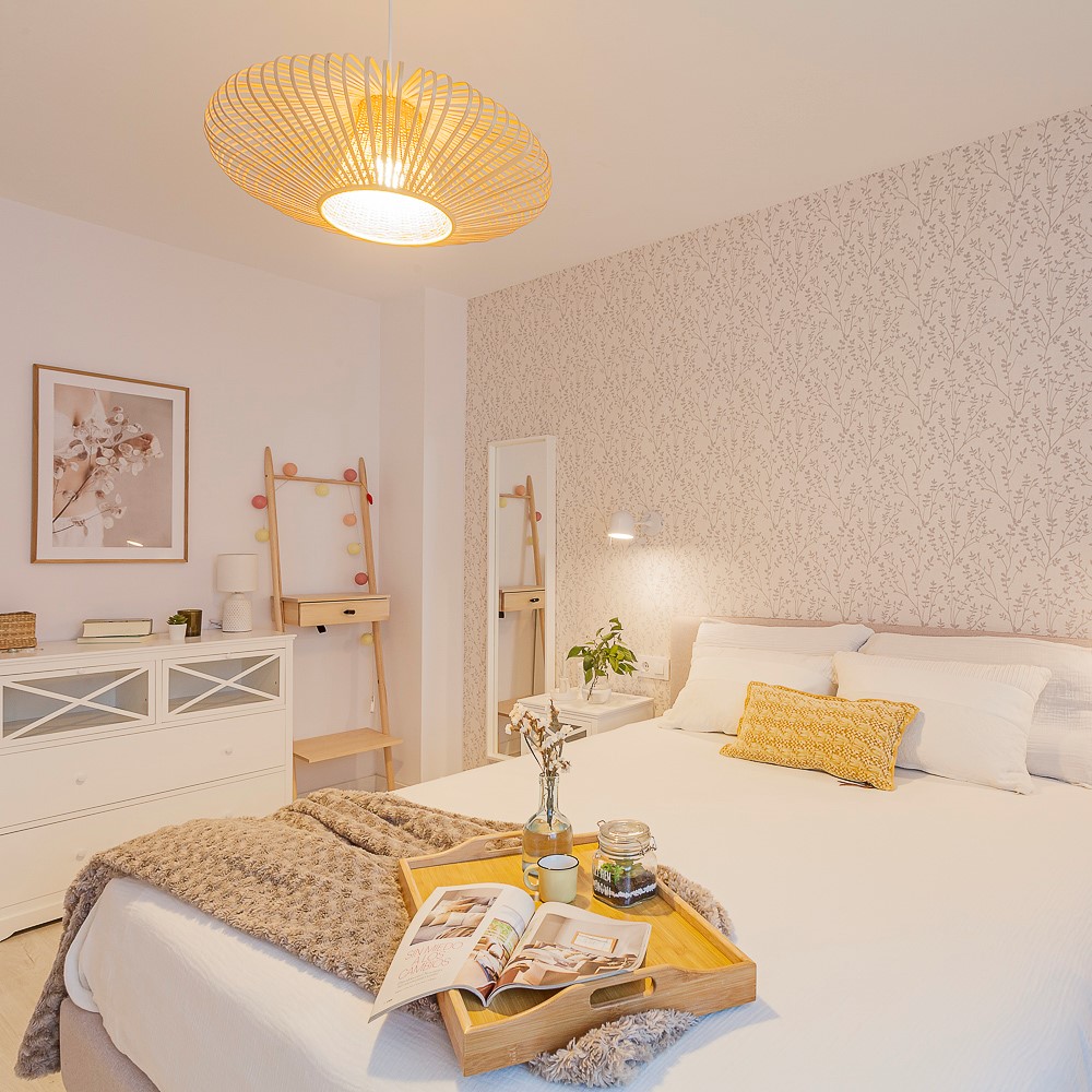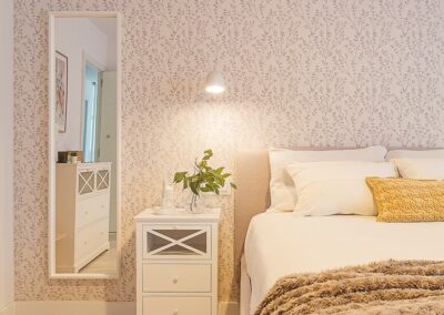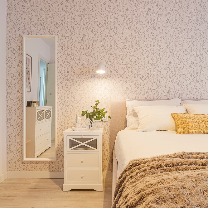 La habitación principal se decoró con un papel pintado que es el protagonista de la estancia, fresco, suave y sutil encaja a la perfección con el estilo romántico del mobiliario.