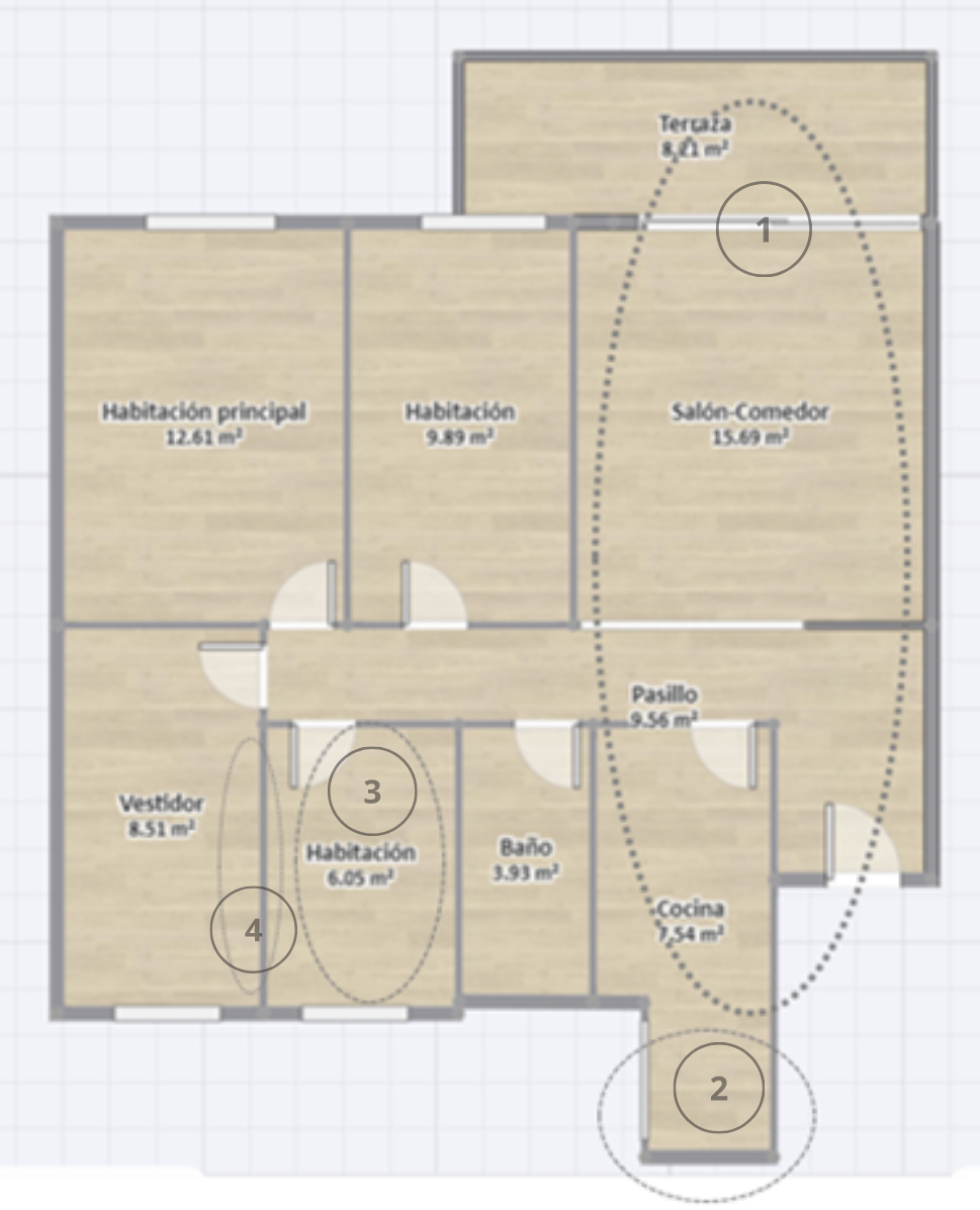 La estructura de la vivienda nos dejó ver claramente que el punto fuerte era conectar entrada, cocina, salón-comedor y terraza. Estas son las acciones que se acordaron para esta reforma integral: